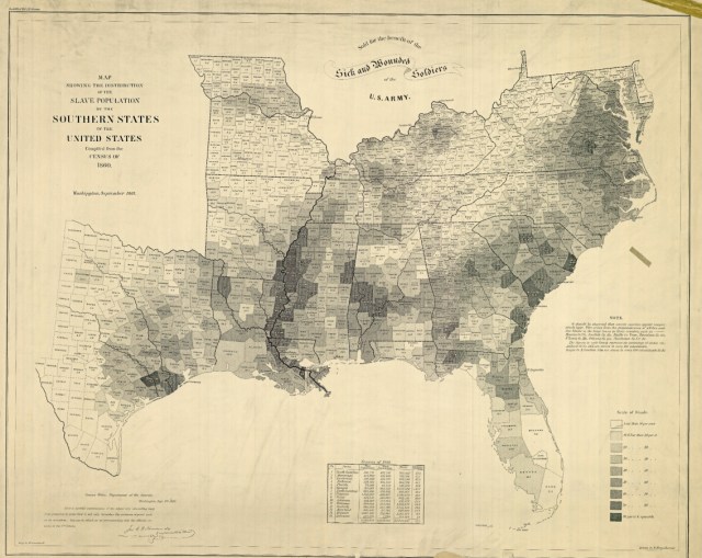 Scholars have debated for years the cause of the war. Some say that war was about slavery, others say that slavery had nothing to do with it, and instead the war centered on the rights of the states. I prefer to split the horns of the dilemma. In 1861 the issue boiled down to Union v. Secession, but slavery formed the vast majority of the subtext related to this question. It lurked underneath most every significant political debate from at least 1846 on, and in some ways, dominated discussions decades before that going back to the Missouri Compromise of 1820. Economic issues did play a part, but they too had a lot to do with slavery. The map below shows the concentration of slaves in the various states. The darker the color, the higher the concentration.